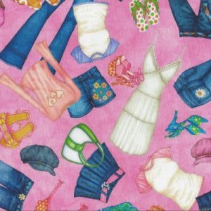 Roze stof met kleding, schoenen en tassen afbeeldingen